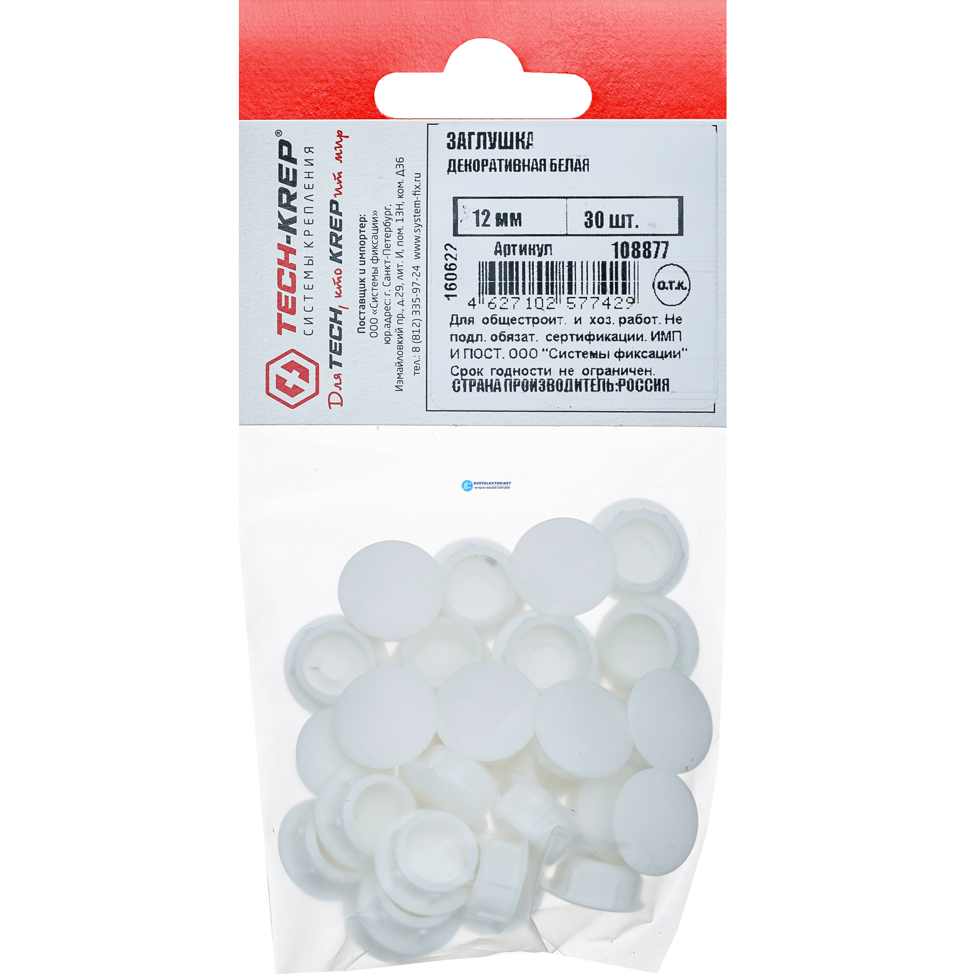 Заглушка декоративная 12 мм белая (30 шт) пакет, код 108877, производитель Tech-KREP