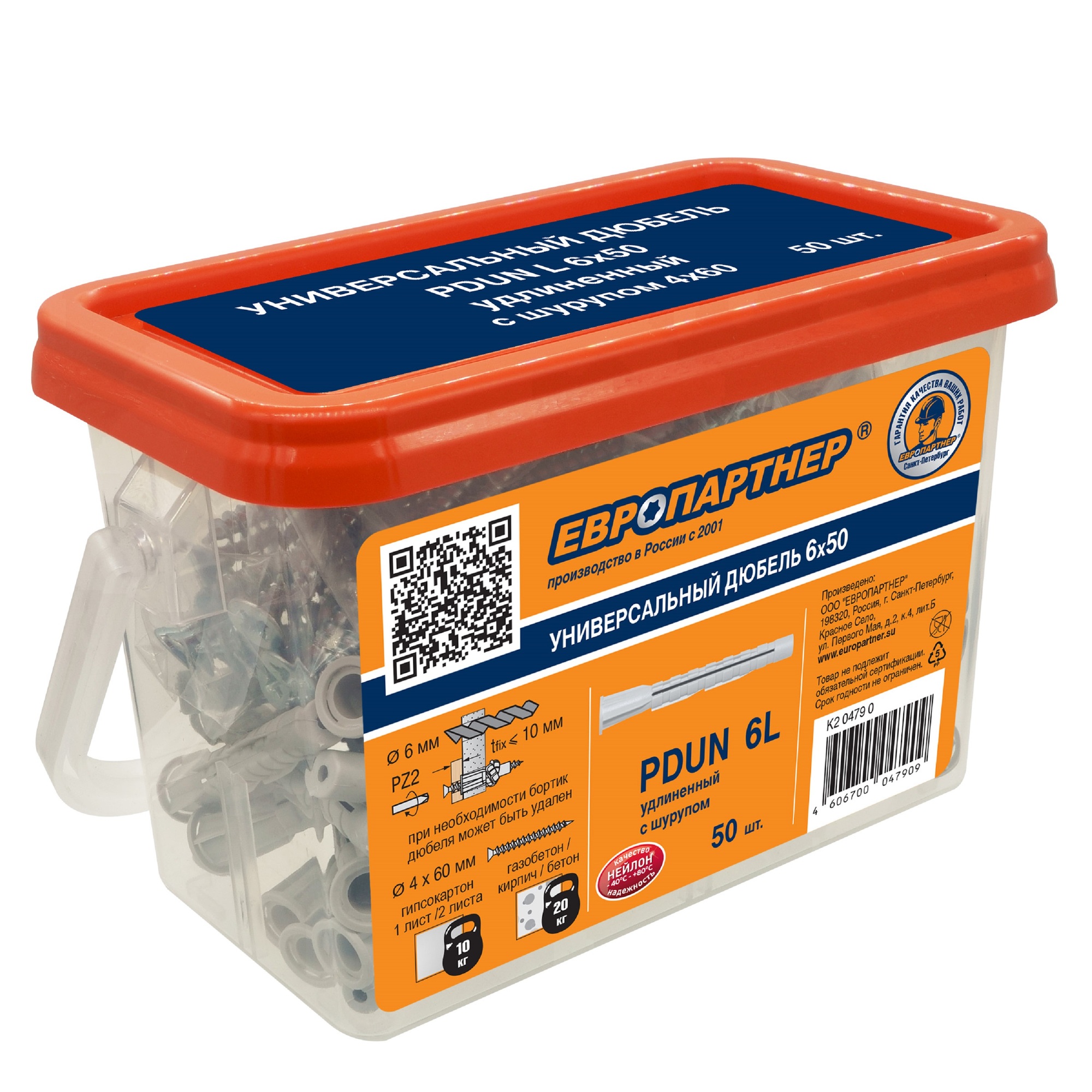 Дюбель универсальный 6х50 с шурупом 4.0х60мм нейлоновый PDUN (уп.50шт), код K2 0479 0, производитель Европартнер