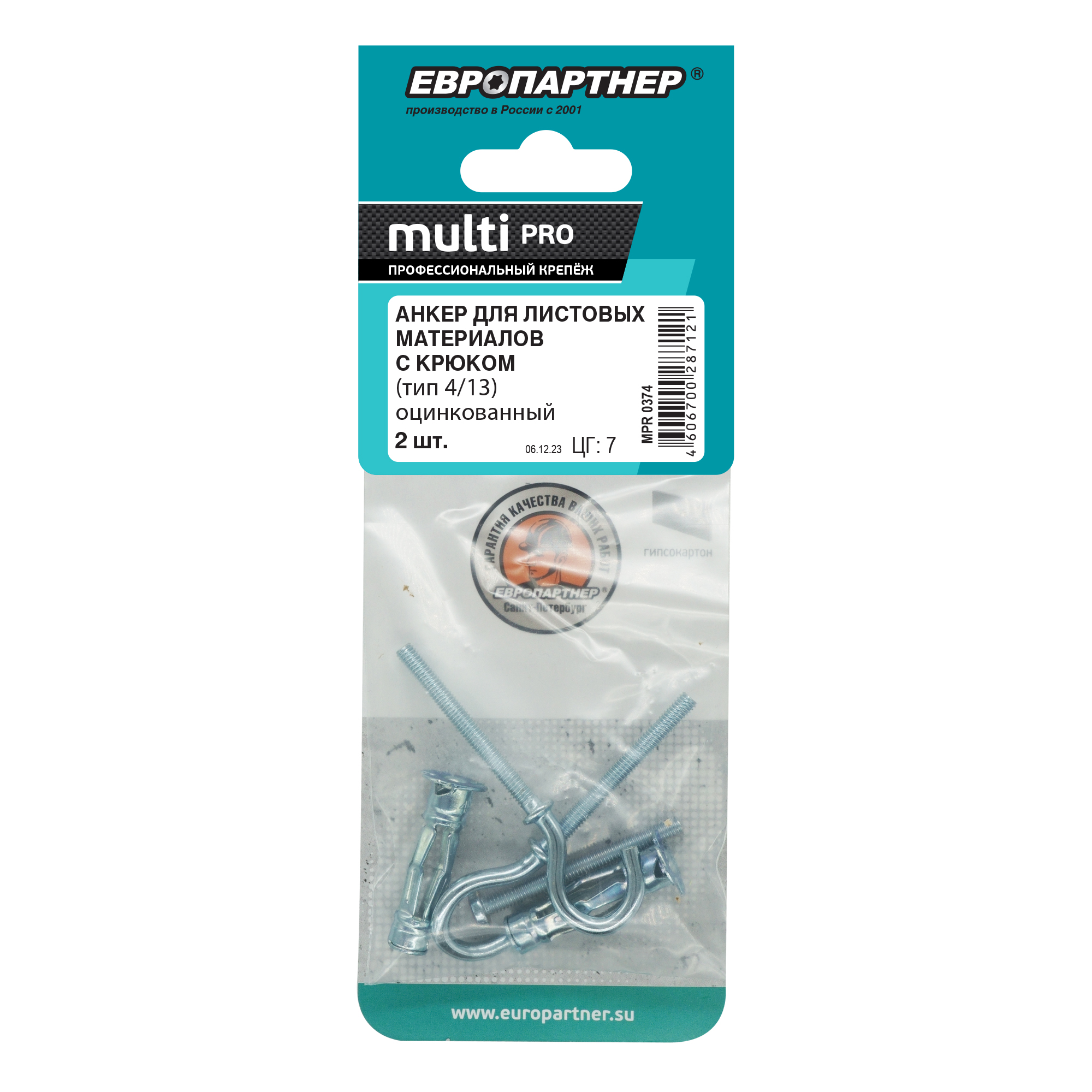 Анкер для листовых материалов с крюком MULTI PRO оцинкованный 4/13 мм (2 шт.), код MPR 0374, производитель Европартнер