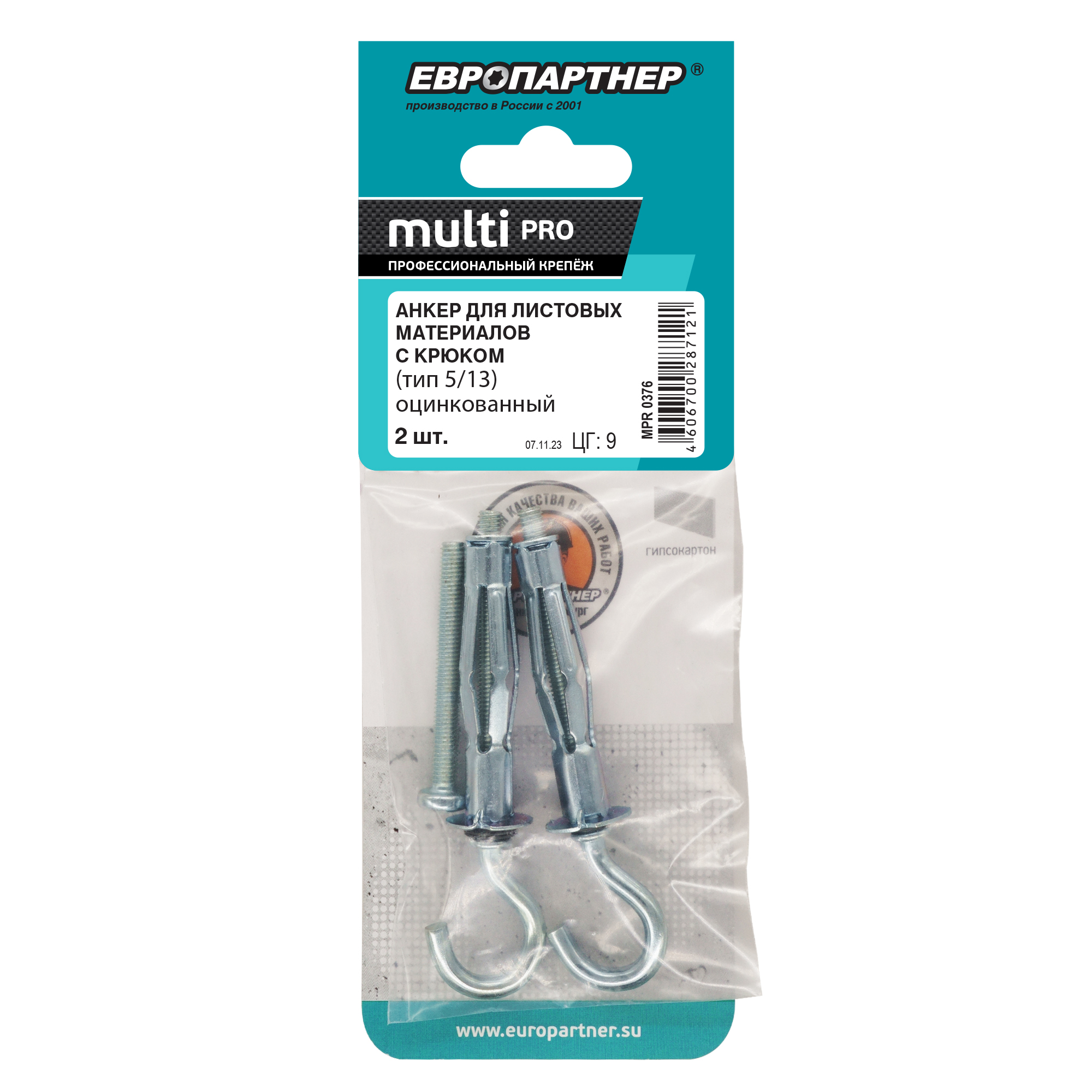 Анкер для листовых материалов с крюком MULTI PRO оцинкованный 5/13 мм (2 шт.), код MPR 0376, производитель Европартнер