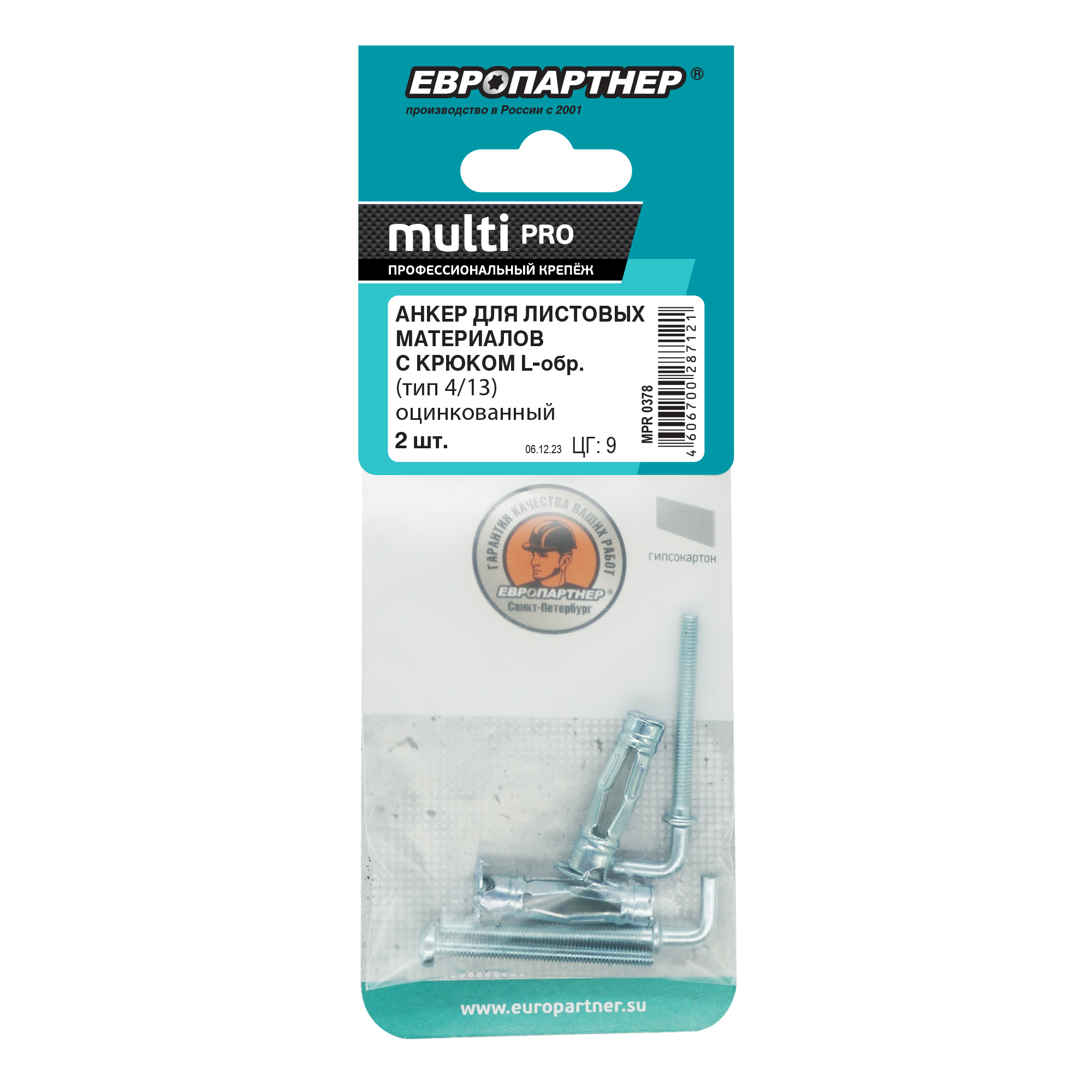 Анкер для листовых материалов с L-обр. крюком MULTI PRO оцинкованный 4/13 мм (2 шт.), код MPR 0378, производитель Европартнер