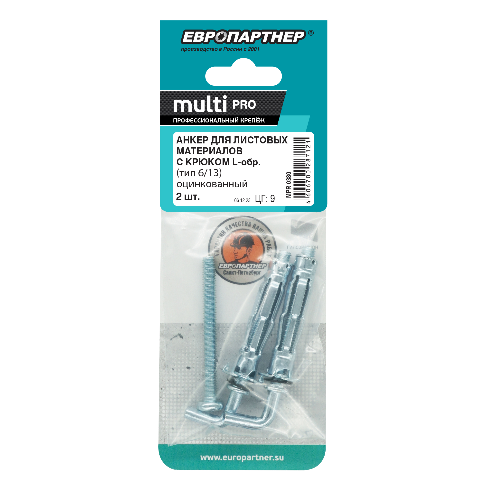 Анкер для листовых материалов с L-обр. крюком MULTI PRO оцинкованный 6/13 мм (2 шт.), код MPR 0380, производитель Европартнер