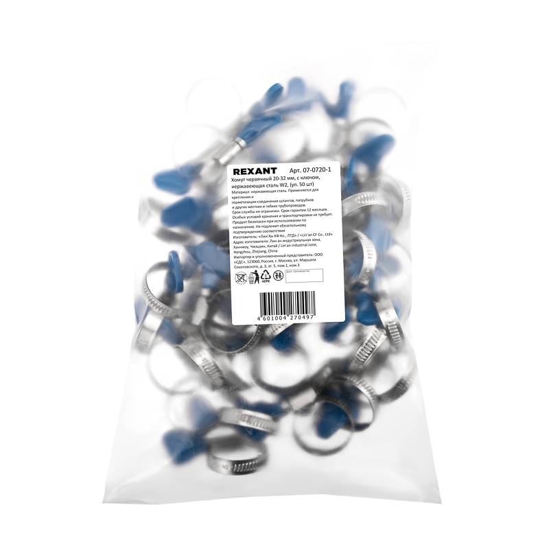 Хомут червячный 20-32/9-0.7 мм. с ключом. нержавеющая сталь W2, код 07-0720-1, производитель REXANT