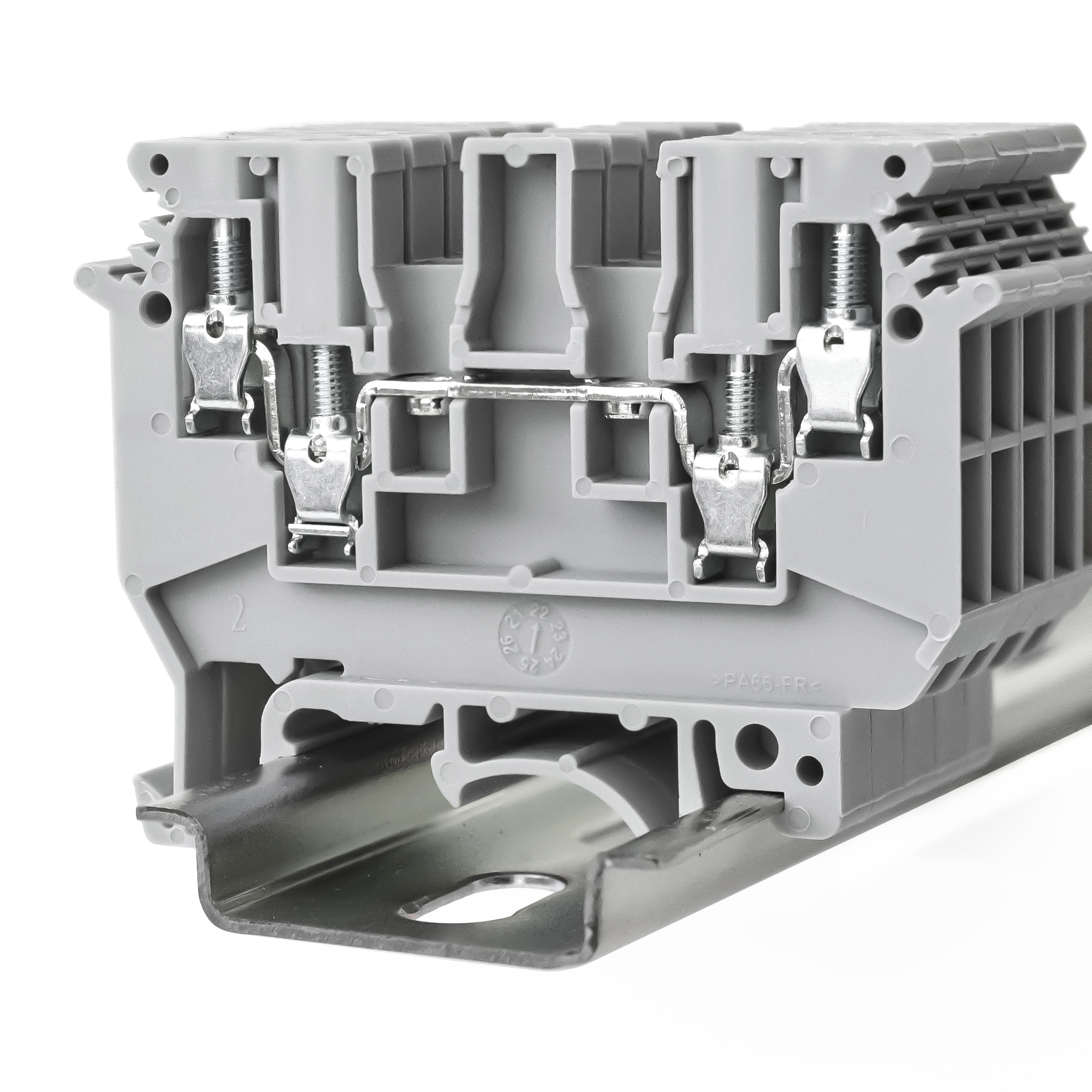 | Преимущества: | Универсальное основание клеммы, подходящее для монтажа на рейках DIN 35/32|Способность пропускать высокие токи через перемычки|Зажимная клеть с защитой от развинчивания: |