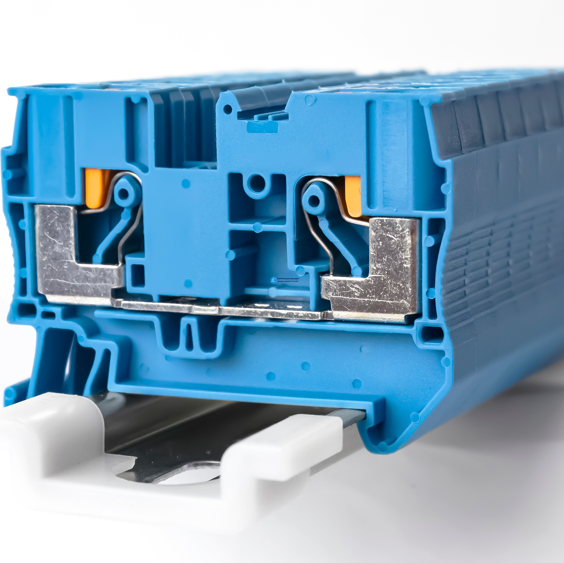 | Преимущества: | Технология Push-in|Сокращение времени монтажа до 80% по сравнению с винтовыми клеммами|Нет необходимости использовать инструмент при монтаже|2 ряда ножевых перемычек|2 боковых и 1 центральный паз для маркировки|Зажимная конструкция из нержавеющей стали|Вибростойкость|Устойчивость к коррозии: |