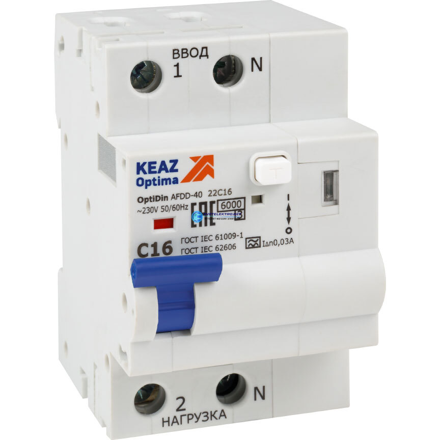 Устройство защиты от дугового пробоя (УЗДП) с АВДТ и защ. от пов. напряж. OptiDin AFDD-40-22C16-A-У3 (2P, C16, 30mA, Uоткл 275В), код 339086, производитель КЭАЗ