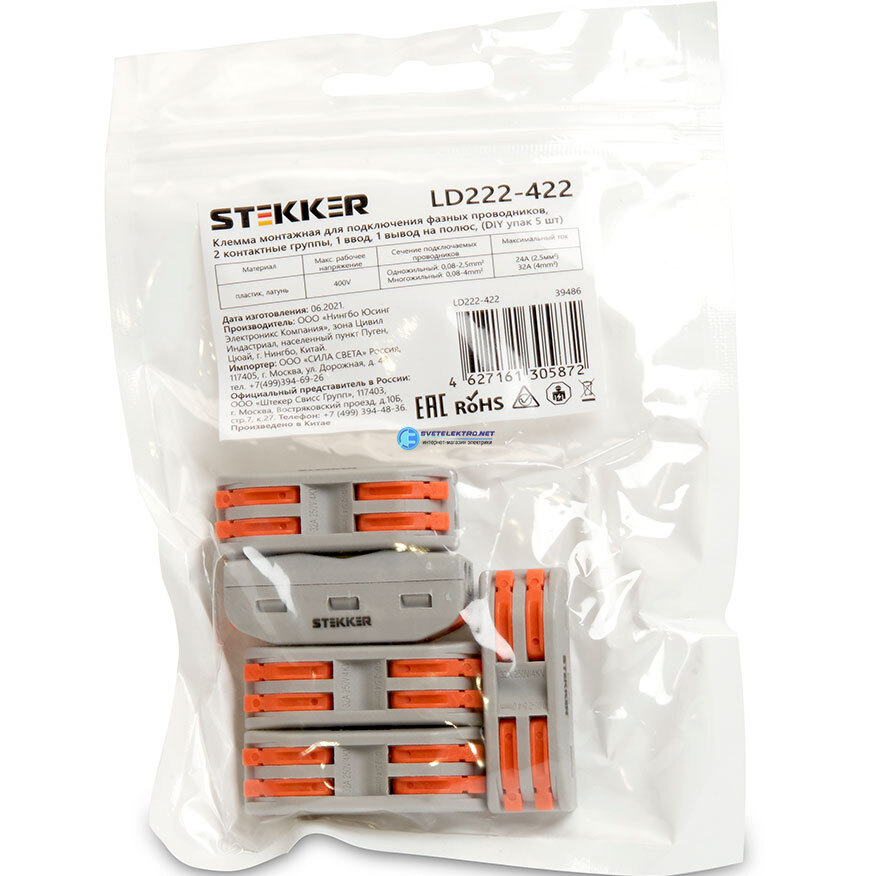 Клемма монтажная для фазных проводников, 2 контактные группы,(DIY упак 5 шт), LD222-422, код 39486, производитель Stekker