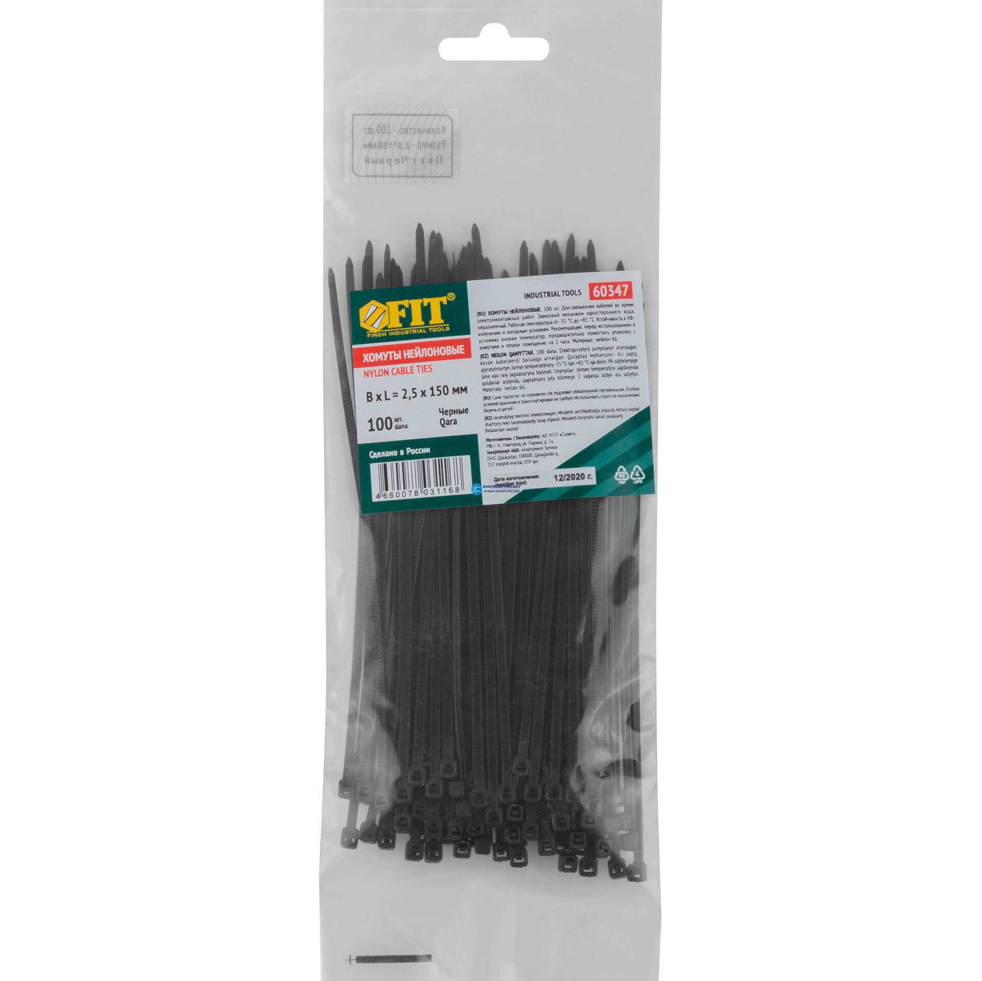 Хомуты нейлоновые для проводов, черные 100 шт., 2,5х150 мм, код 60347, производитель FIT