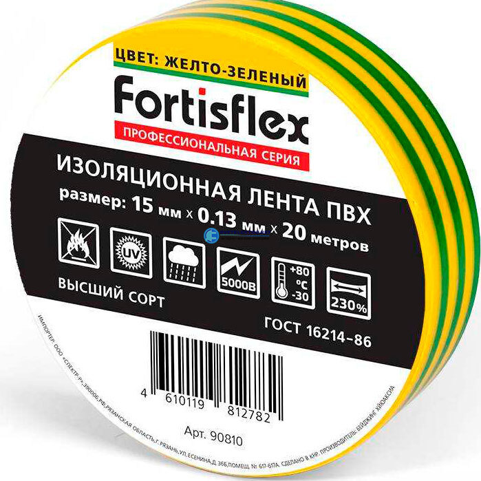 Изолента ПВХ 15x0.13х20 (ж/з), код 90810, производитель КВТ