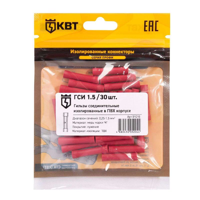 Гильза соединительная изолированная ГСИ 1.5 (30 шт), код 91016, производитель КВТ