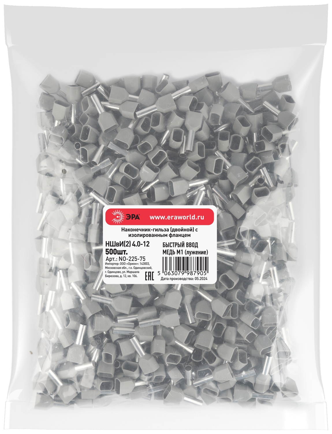 Наконечник-гильза с изолированным фланцем (упаковка 500 шт.) NO-225-75 (двойной) НШвИ(2) 4,0-12, код Б0063346, производитель ЭРА