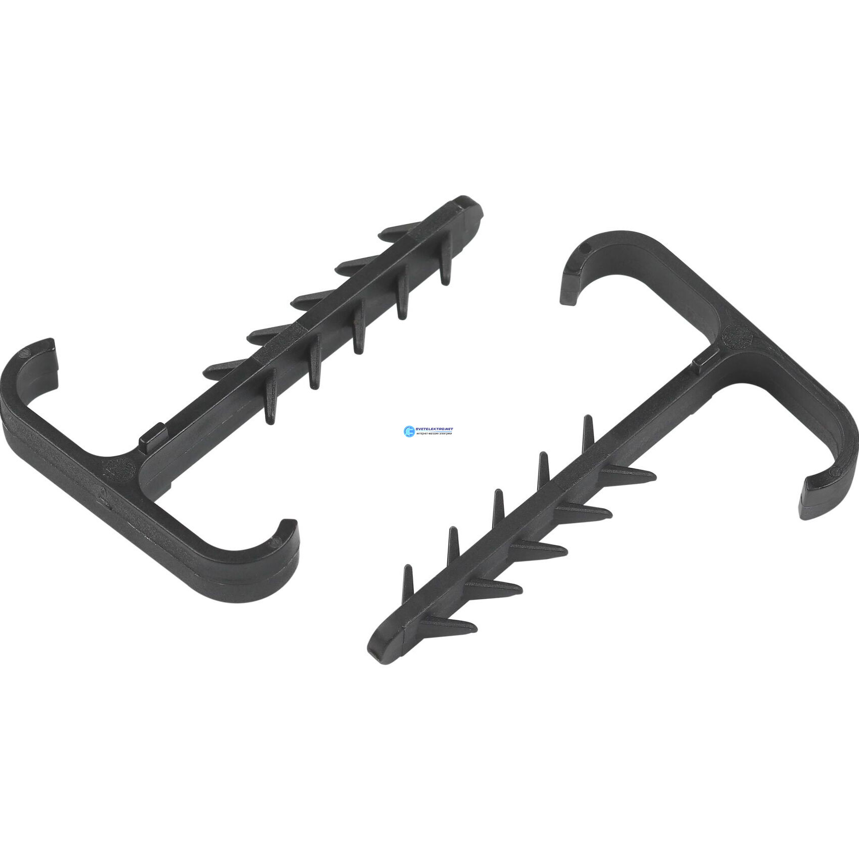 | Преимущества: | Позволяет проложить 2 кабеля одновременно как вертикально, так и горизонтально|Надежное крепление проводника в стене благодаря увеличенным зубьям|Материал изделия не поддерживает горение: |