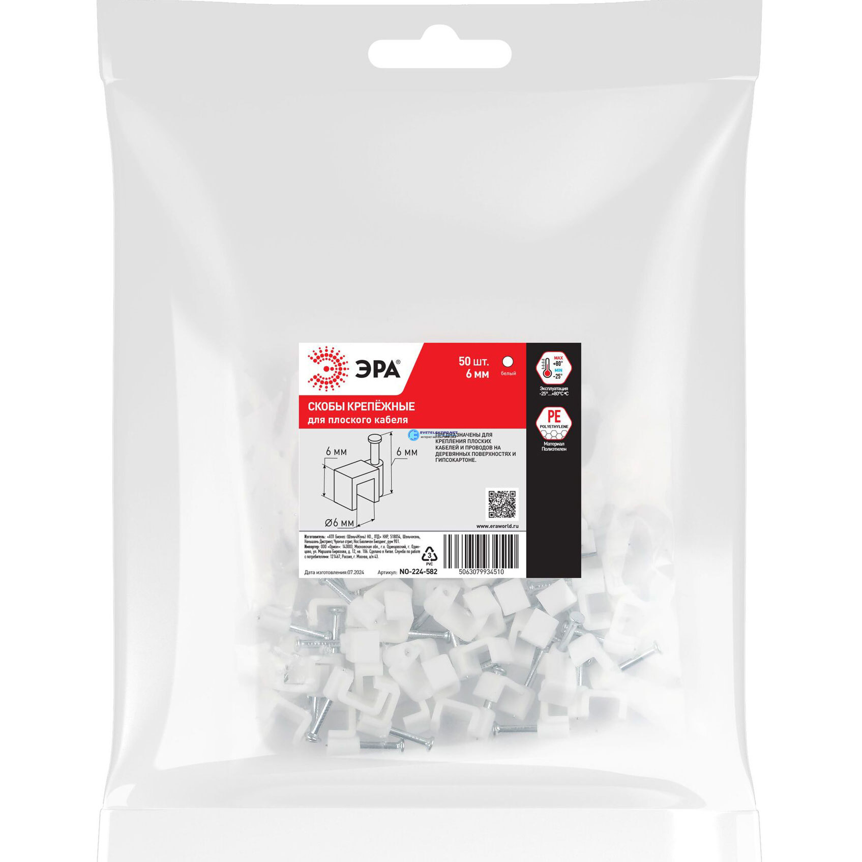 Скоба пластиковая крепежная плоская мм белая NO-224-582 (50 шт/уп), код Б0066625, производитель ЭРА