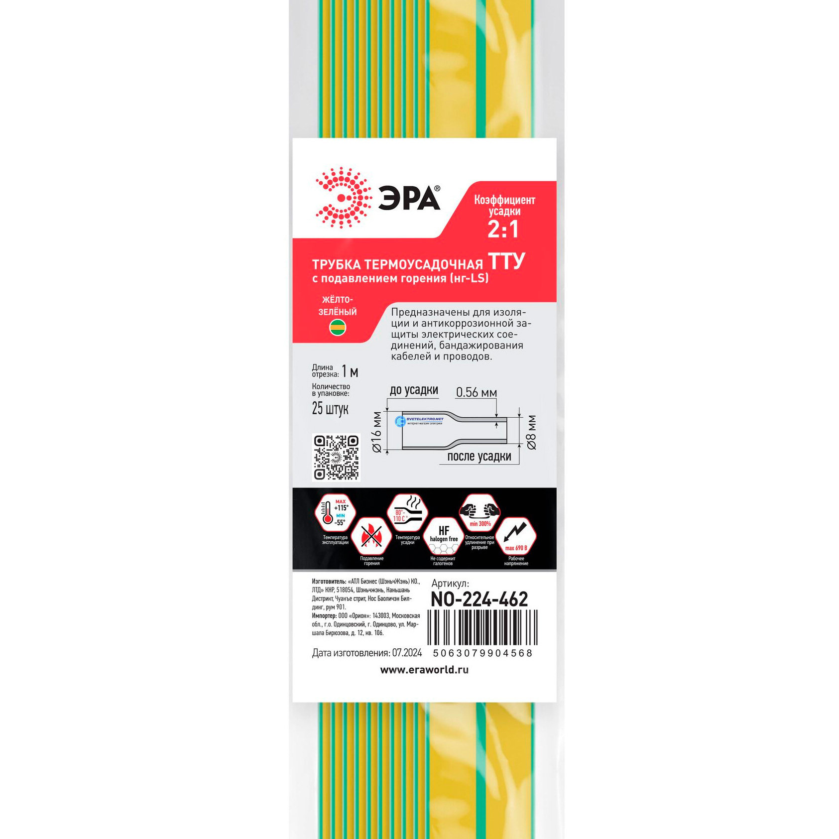 Трубка термоусадочная ТТУ нг-LS 16/8 жёлто-зелёная в отрезках по 1 м NO-224-462, код Б0067458, производитель ЭРА
