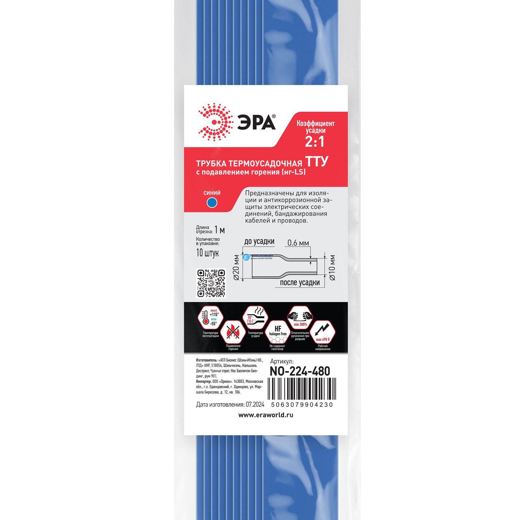 Трубка термоусадочная ТТУ нг-LS 20/10 синяя в отрезках по 1 м. NO-224-480, код Б0067524, производитель ЭРА