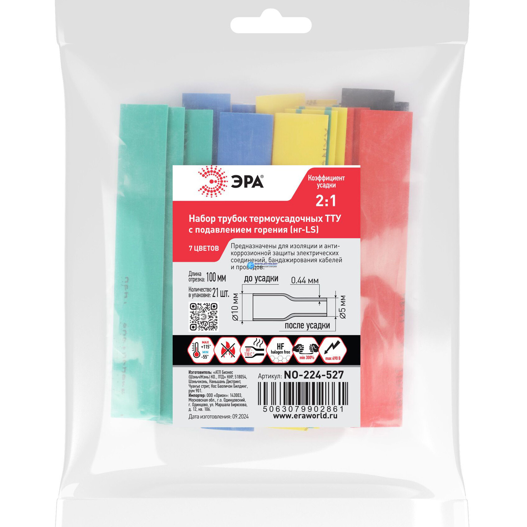 Набор термоусадочных трубок ТТУнг-LS 10/5 цветов по 3 шт. (L= 100мм), код Б0067641, производитель ЭРА