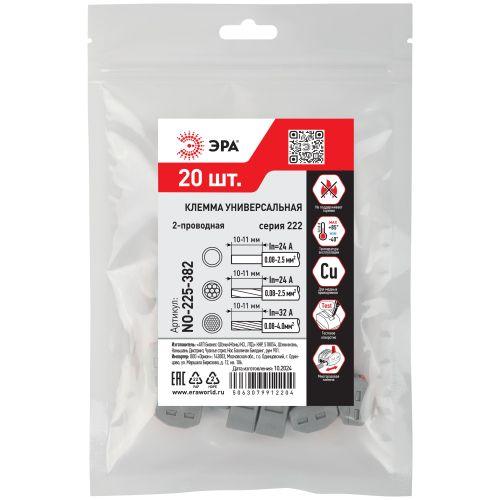 Клемма универсальная 222-412 с рычагами 2-проводная 0.08-2.5/4 мм2 NO-225-382 (упаковка 20 шт.), код Б0067878, производитель ЭРА