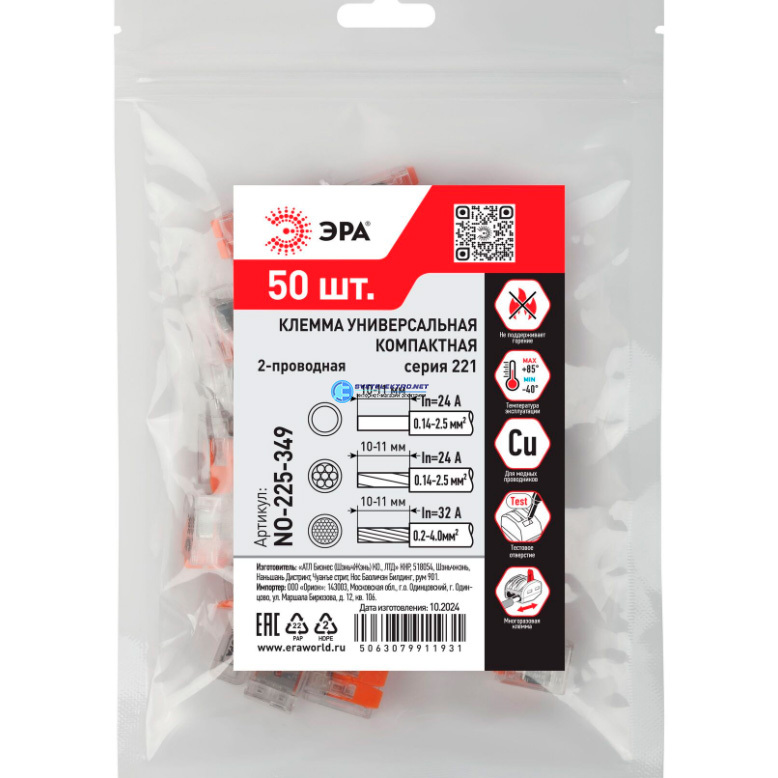Клемма универсальная 221-412 компактная с рычагами 2-проводная 0.2-4 мм2 NO-225-349 (упаковка 50 шт.), код Б0067896, производитель ЭРА