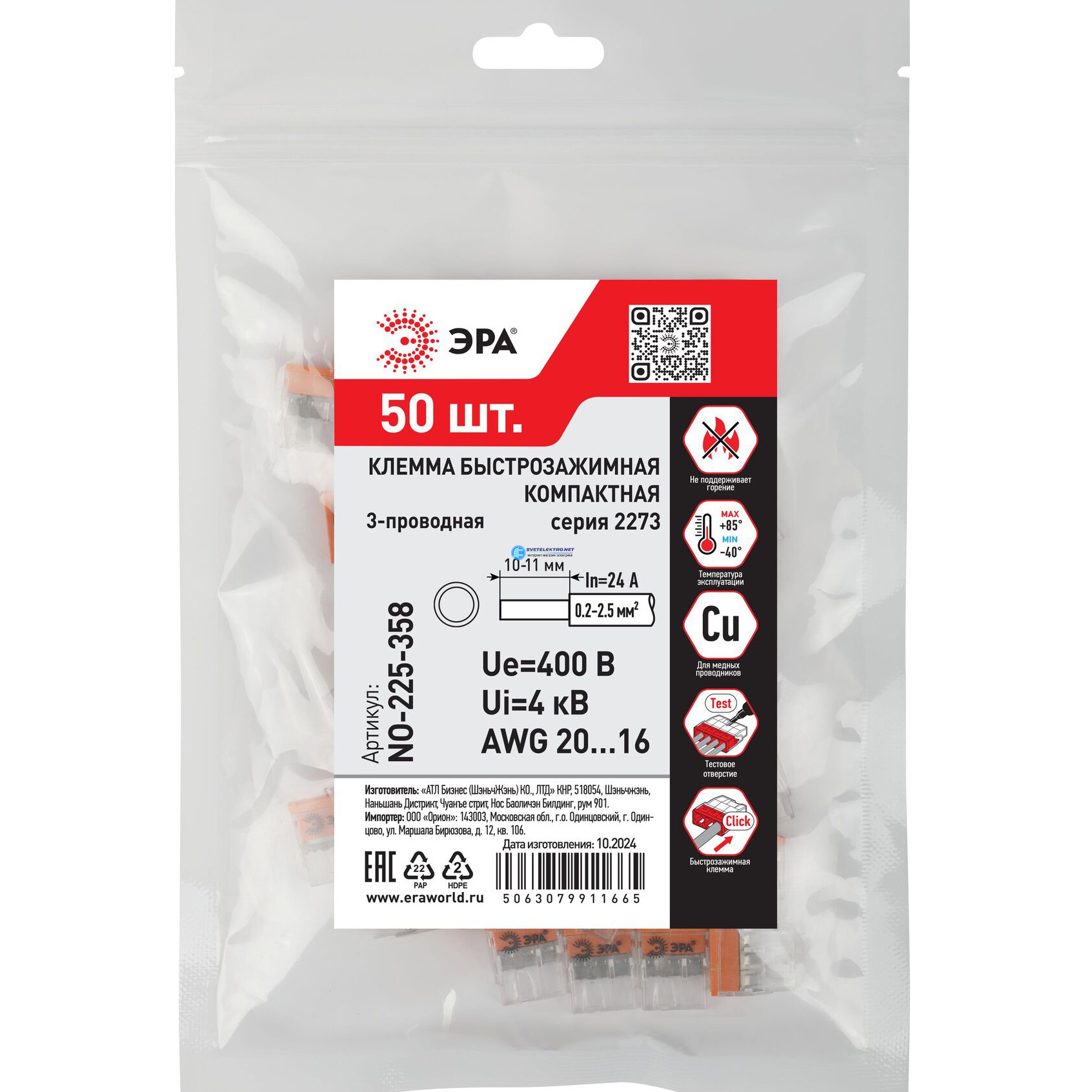 Клемма быстрозажимная 2273-203 компактная 3-проводная 0.2-2.5 мм2 NO-225-358 (упаковка 50 шт.), код Б0067904, производитель ЭРА