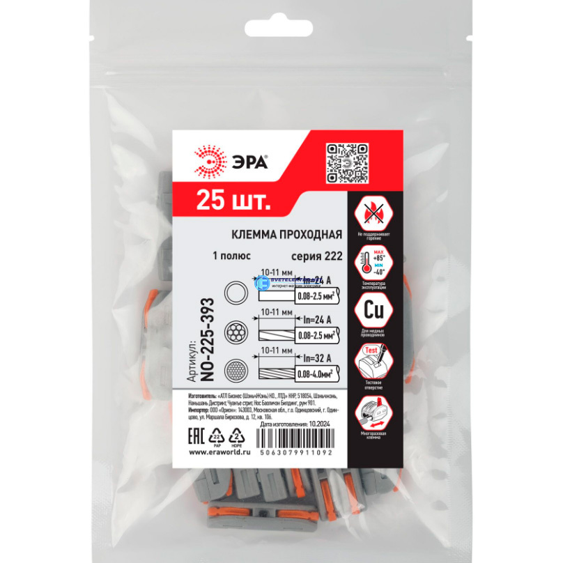 Клемма проходная 222-24 с рычагами полюс 0.08-2.5/4 мм2 NO-225-393 упаковка 25 шт, код Б0067912, производитель ЭРА