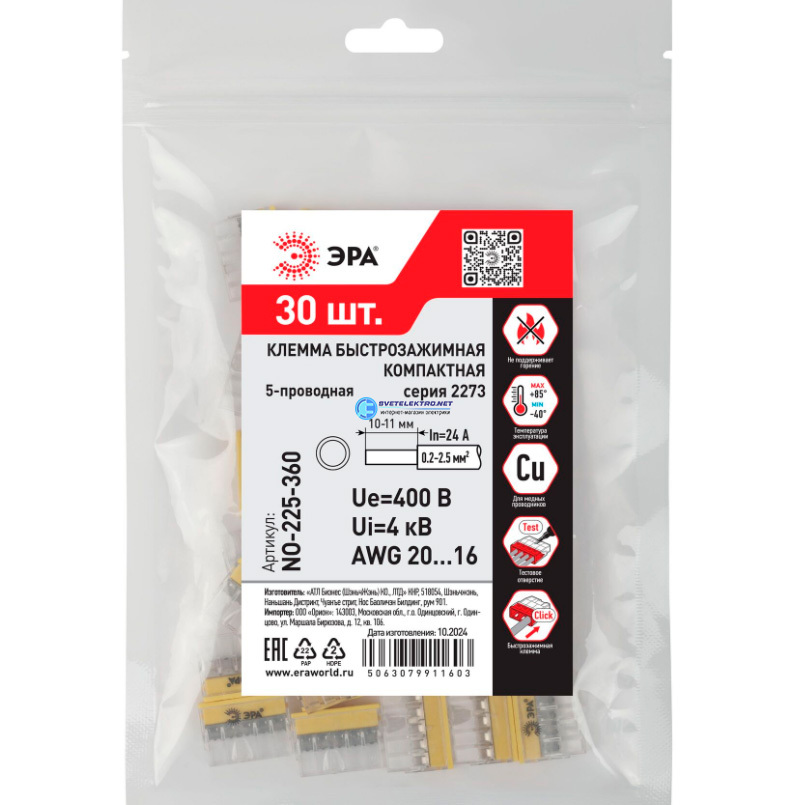 Клемма быстрозажимная 2273-205 компактная 5-проводная 0.2-2.5 мм2 NO-225-360 (упаковка 30 шт.), код Б0067925, производитель ЭРА