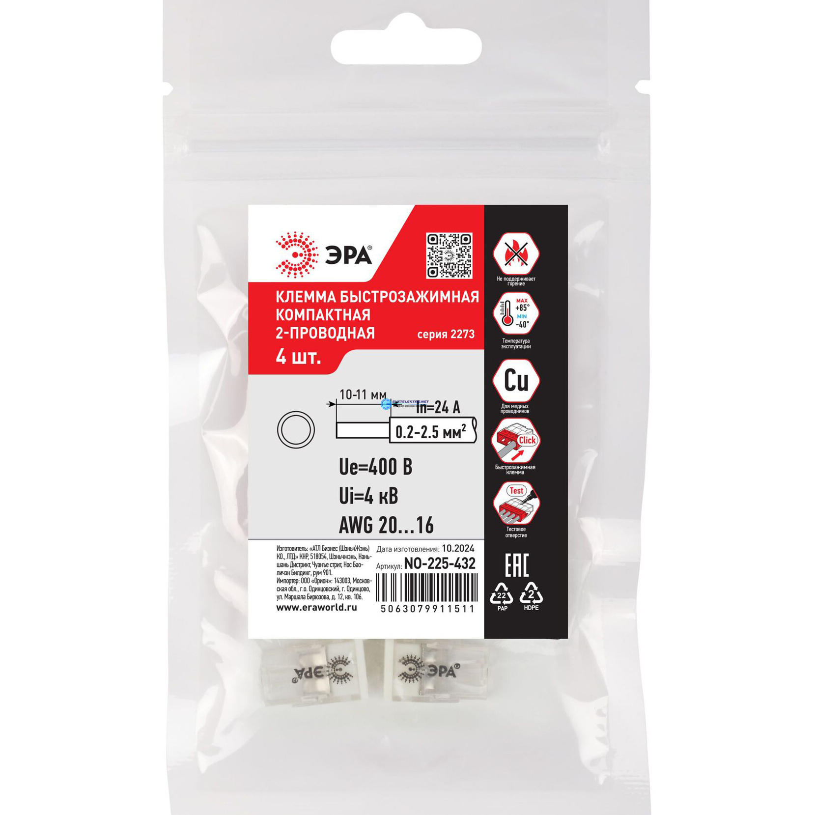 Клемма быстрозажимная 2273-202 компактная 2-проводная 0.2-2.5 мм2 NO-225-432 (упаковка 4 шт.), код Б0067929, производитель ЭРА