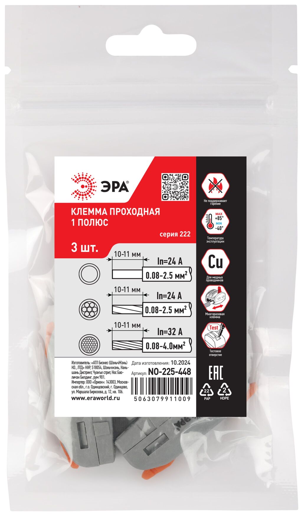 Клемма проходная 222-2411 с рычагами 1 полюс 0.08-2.5/4 мм2 NO-225-448 (упаковка шт.), код Б0067935, производитель ЭРА