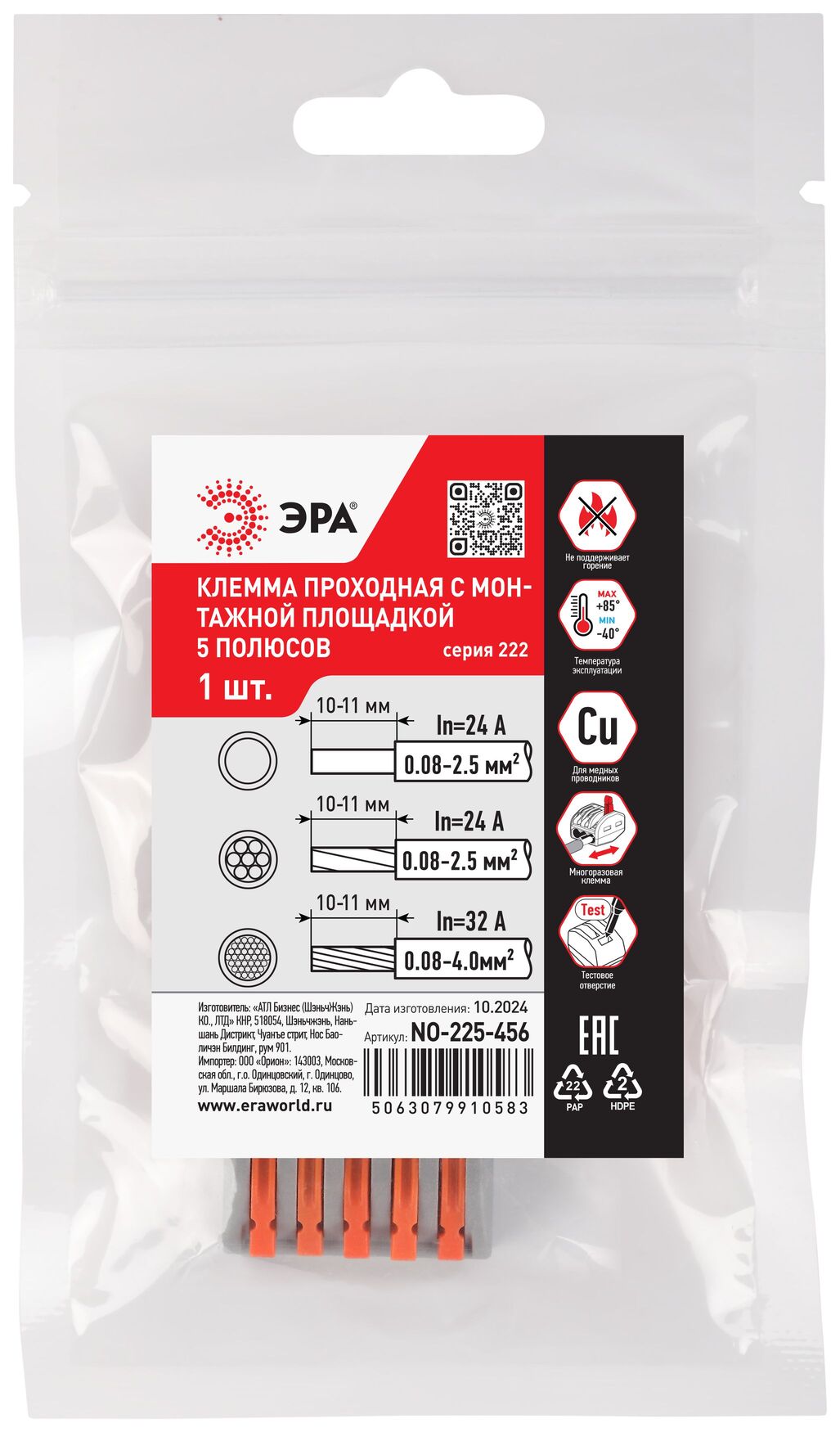 Клемма проходная с монтажной площадкой 222-241Р с рычагами полюсов мм2 (упаковка 1 шт.), код Б0067945, производитель ЭРА