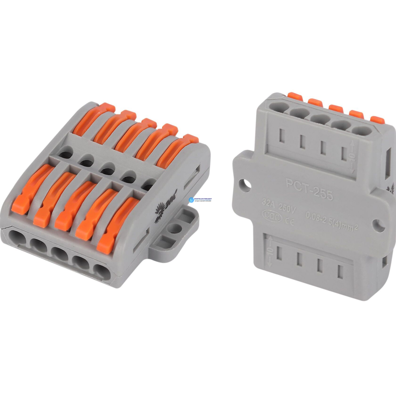 | Преимущества: | В конструкции корпуса предусмотрены монтажные площадки с крепежными отверстиями|Обеспечивает многоразовый монтаж и демонтаж всех типов медных проводников сечением до 4.0 мм2: одножильных, многожильных и тонкопроволочных|Надёжное и долговременное соединение проводов|Возможность легко и быстро отсоединить провода, изменить схему, подключить доп. устройство|Исходное положение рычага исключает случайное разъединение подключённого проводника|Изделия обладают тестовыми отверстиями, которые дают возможность измерения электрических параметров цепи соединения|Корпус выполнен из полиамида 6.6. Не поддерживает горение, не содержит галогенов по UL94V5|Хорошая электропроводность и низкий нагрев клеммы: |
