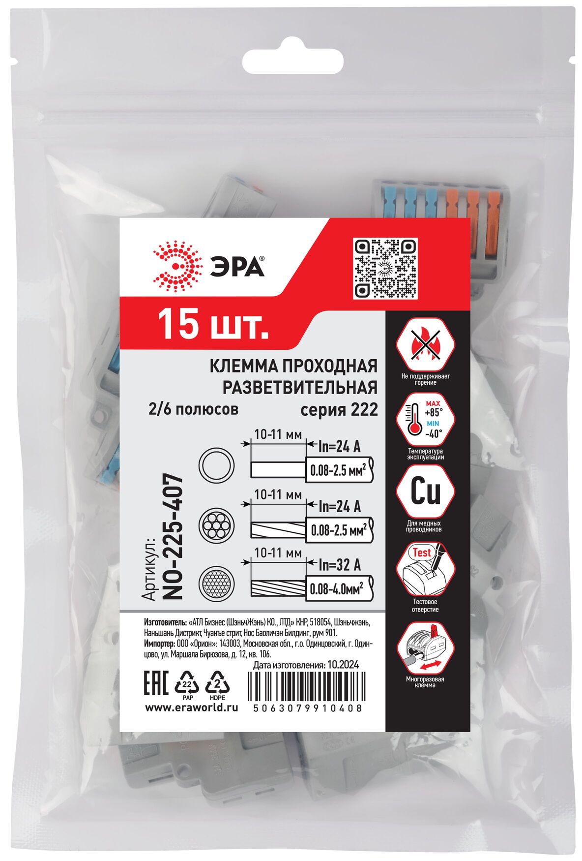 Клемма проходная разветвительная 222-4126 с рычагами 2/6 полюсов 0.08-2.5/4 мм2 NO-225-407 (упаковка 15 шт.), код Б0067952, производитель ЭРА