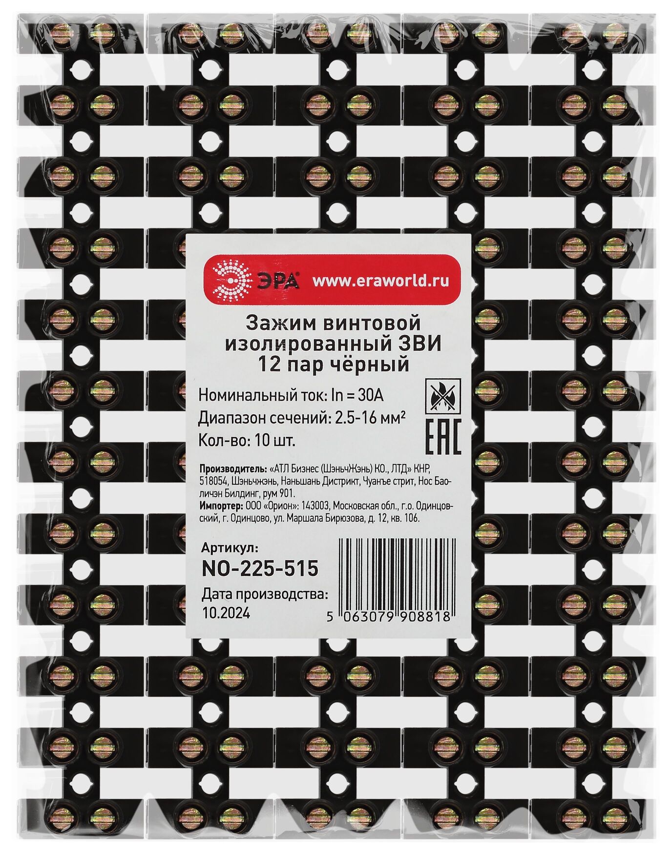 Зажим винтовой изолированный ЗВИ-нг 30А (2.5-16 мм2) NO-225-515 12 пар чёрный, код Б0068007, производитель ЭРА