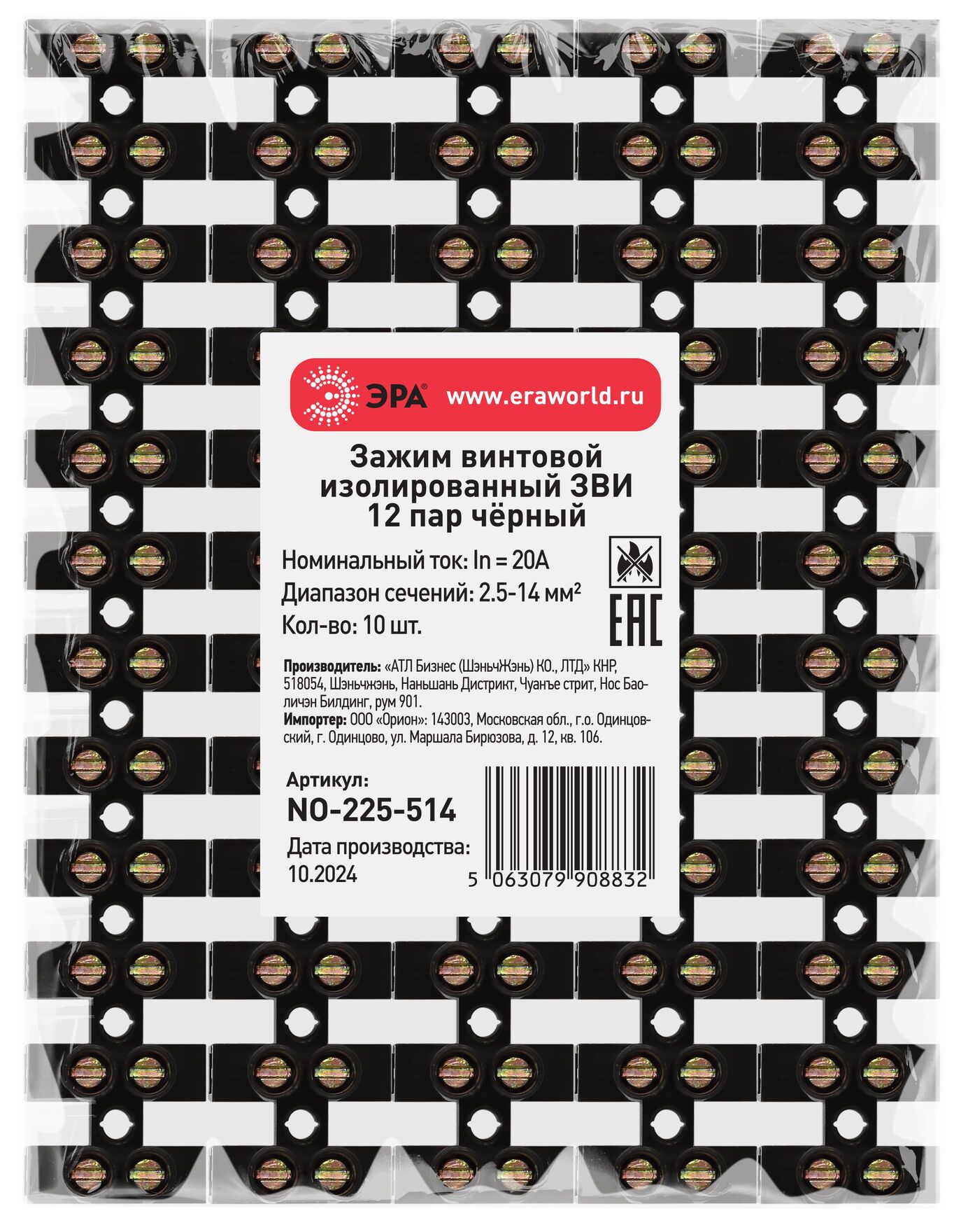 Зажим винтовой изолированный ЗВИ-нг 20А (2.5-14 мм2) NO-225-514 12 пар чёрный, код Б0068040, производитель ЭРА