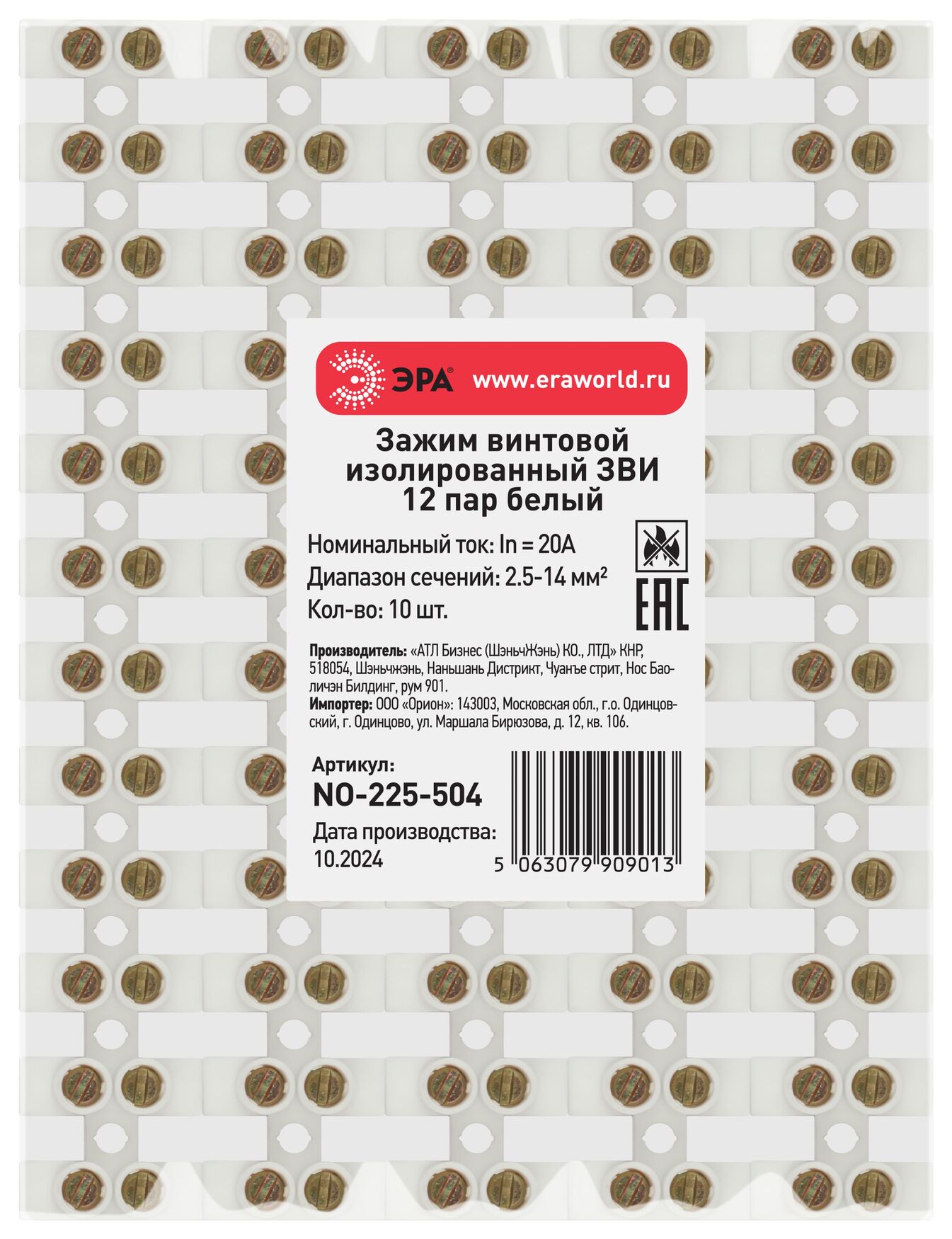 Зажим винтовой изолированный ЗВИ-нг 20А (2.5-14 мм2) NO-225-504 12 пар белый, код Б0068076, производитель ЭРА