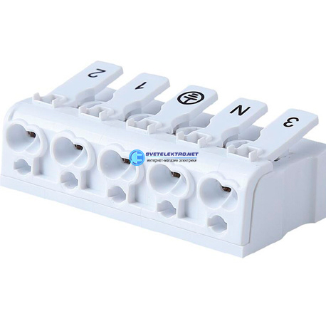 Клеммник 5 конт. зажимн. (марк. 3/N/ Земля/1/2) ш.10.0мм, с заземл.(2.5 кв.мм) CM-238-D-5P Fucon