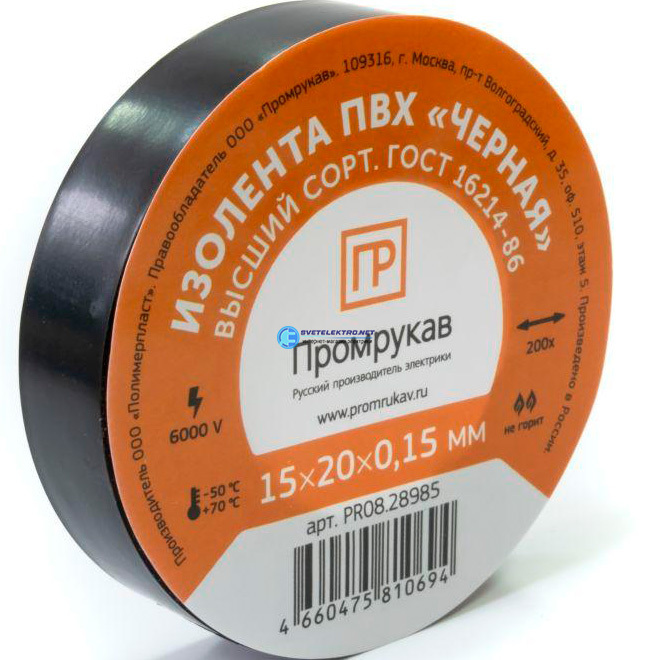 Изолента ПВХ черная 0,15 x 15 х 20 (10 шт/уп), код PR08.28777, производитель Промрукав