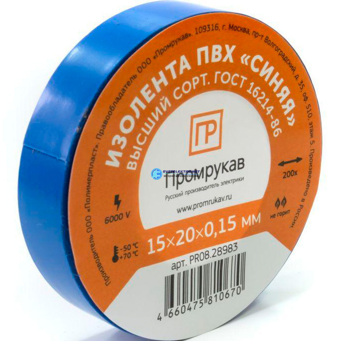 Изолента ПВХ синяя 0,15 x 15 х 20 (10 шт/уп), код PR08.28778, производитель Промрукав
