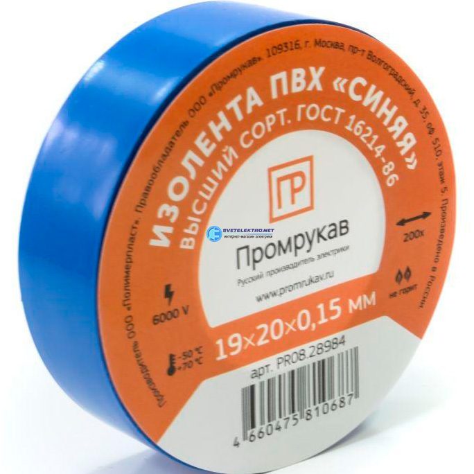Изолента ПВХ синяя 0,15 x 19 х 20 ( шт/уп), код PR08.28789, производитель Промрукав