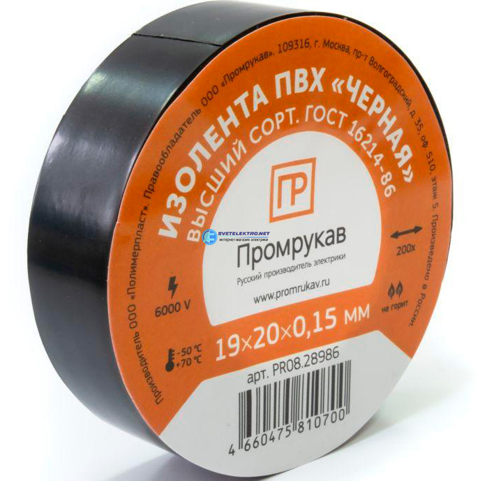 Изолента ПВХ черная 0,15 x 19 х 20 ( шт/уп), код PR08.28790, производитель Промрукав