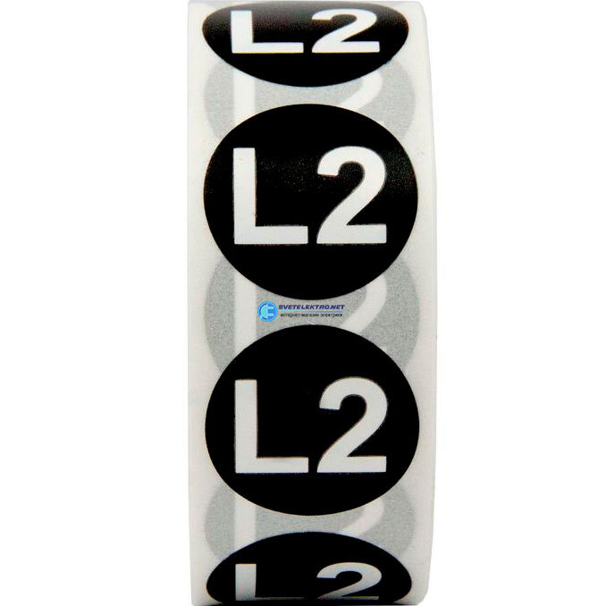 "Маркировка электрических шин. Диаметр 40мм, круг. Цвет - черный, символ - ""L2"" белого цвета. Упак овка - 500 шт." SL-D40-L2-BK DKC
