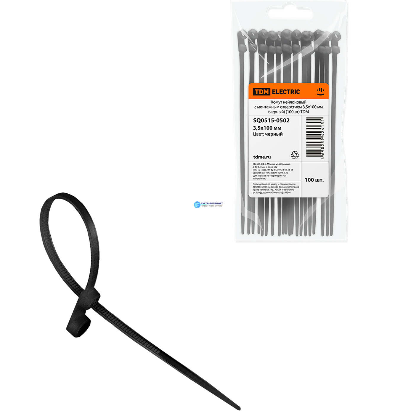 Хомут нейлоновый с монтажным отверстием 4,3х200 мм (черный) (100шт), код SQ0515-0506, производитель TDM