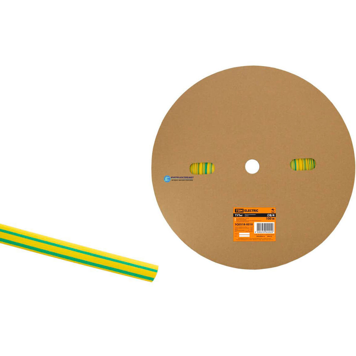 Термоусаживаемая трубка ТУТнг 8/4 желто-зеленая (100 м/ролл), код SQ0518-0010, производитель TDM