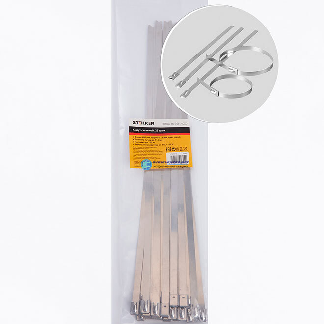 Хомут стальной 7.9х400мм, d пучка max 114мм, нагрузка 120кг, серый (25шт в упак),, код 32802, производитель Stekker