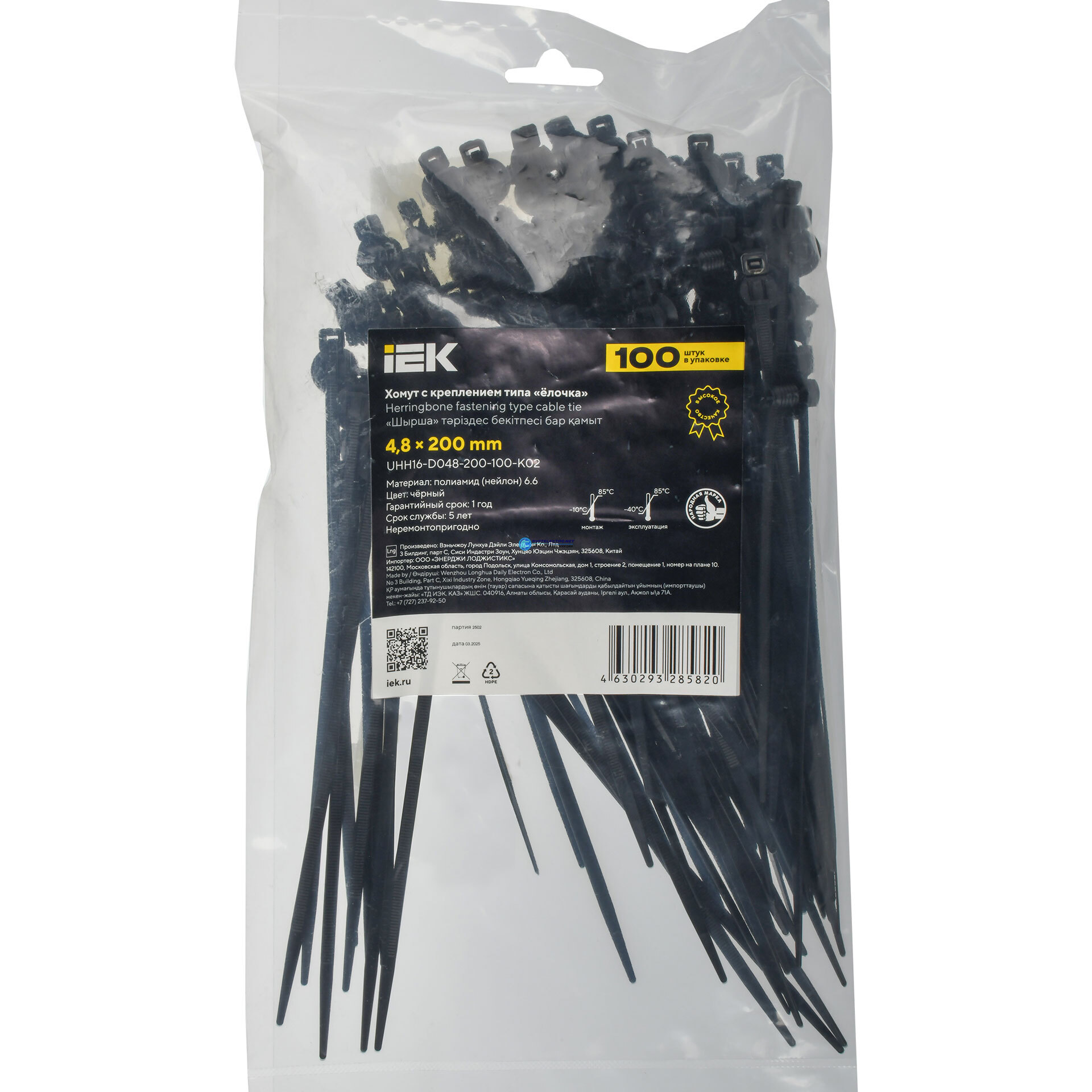 Хомут P6.6 с креплением на елочку черный 4.8х200мм 100шт/упак, код UHH16-D048-200-100-K02, производитель IEK