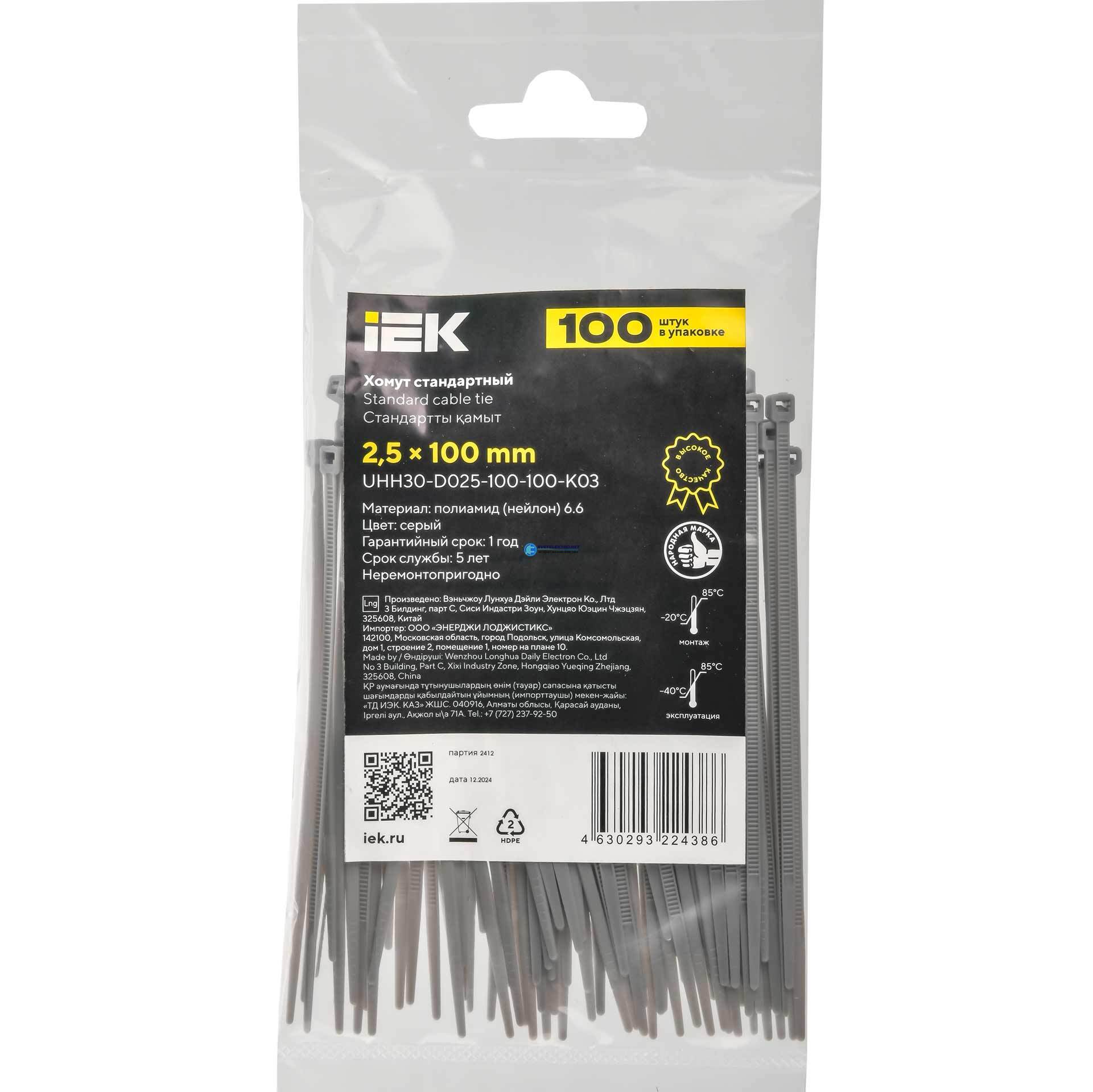 Хомут P6.6 стандартный серый 2.5х100мм 100шт/упак, код UHH30-D025-100-100-K03, производитель IEK