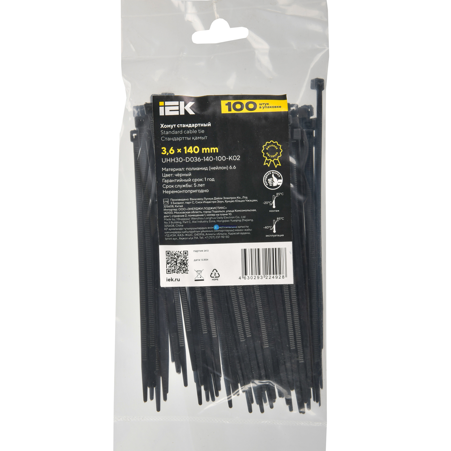 Хомут P6.6 стандартный черный 3.6х140мм 100шт/упак, код UHH30-D036-140-100-K02, производитель IEK