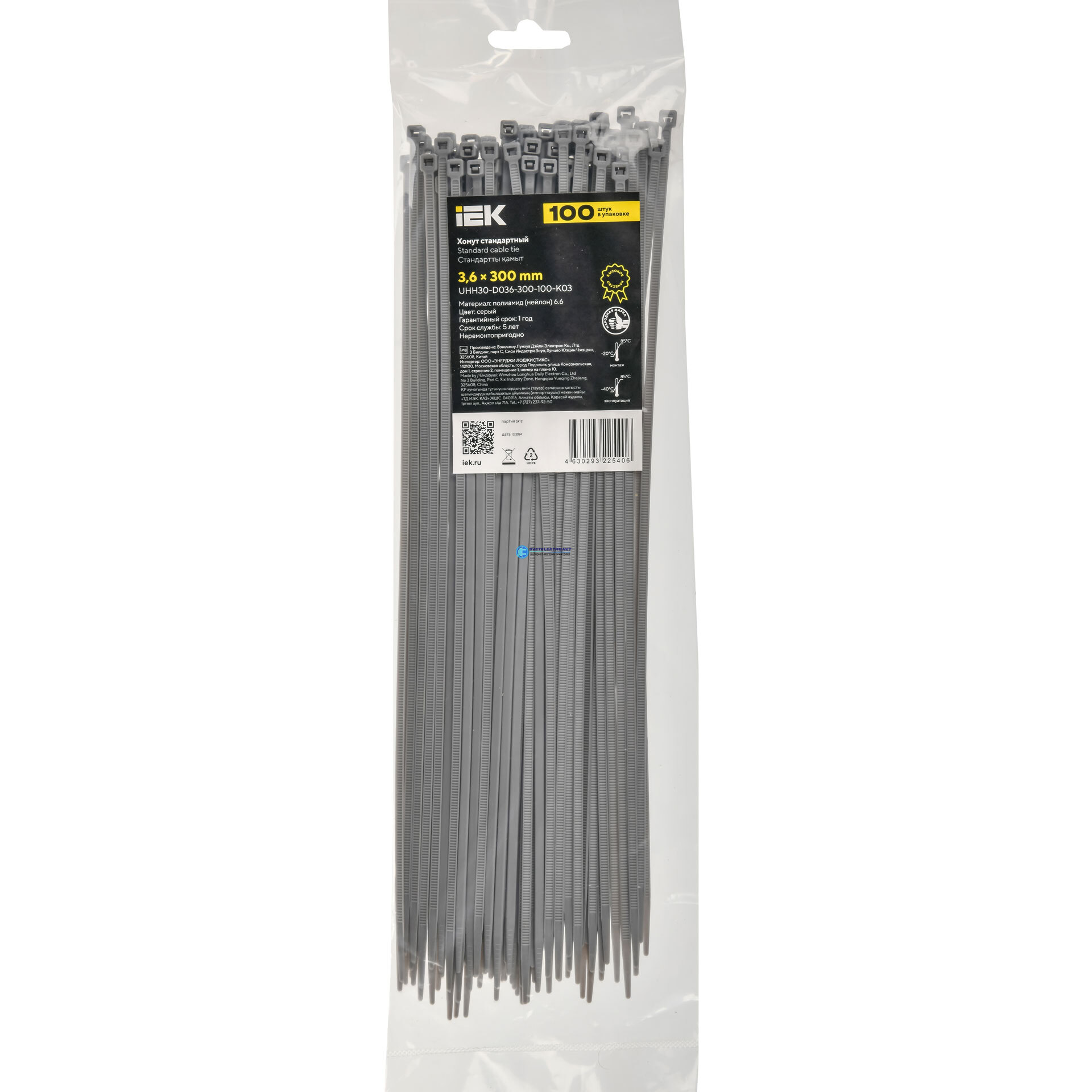 Хомут P6.6 стандартный серый 3.6х300мм 100шт/упак IEK UHH30-D036-300-100-K03 IEK