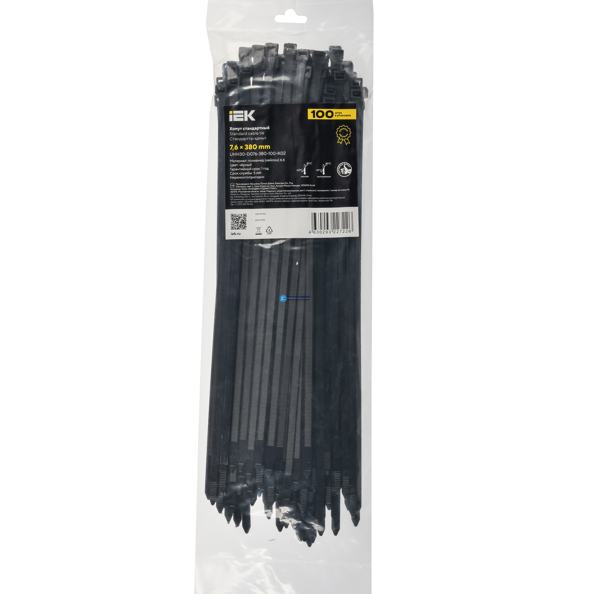 Хомут P6.6 стандартный черный 7.6х380мм 100шт/упак, код UHH30-D076-380-100-K02, производитель IEK