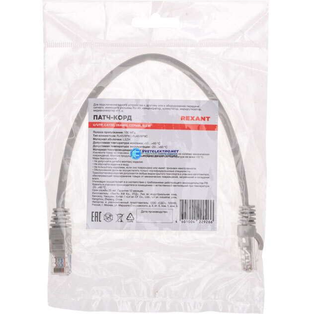 Патч-корд U/UTP, CAT 5e, RJ45-RJ45, 26AWG, LSZH, серый, 0,3м,, код 02-0100-03, производитель REXANT
