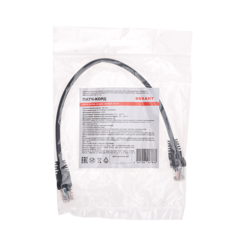 Патч-корд U/UTP, CAT 5e, RJ45-RJ45, 26AWG, LSZH, черный, 0,3м,, код 02-0102-03, производитель REXANT