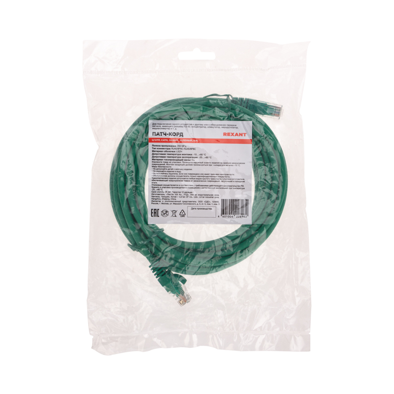 Патч-корд U/UTP CAT 6, RJ45-RJ45, 26AWG, LSZH, зеленый, 5м,, код 02-0296-5, производитель REXANT